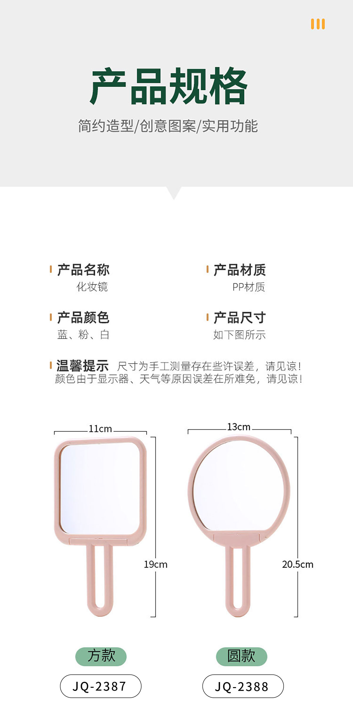 Size: JQ-2387(方鏡):110*190mm JQ-2388(圓鏡):130*205mm