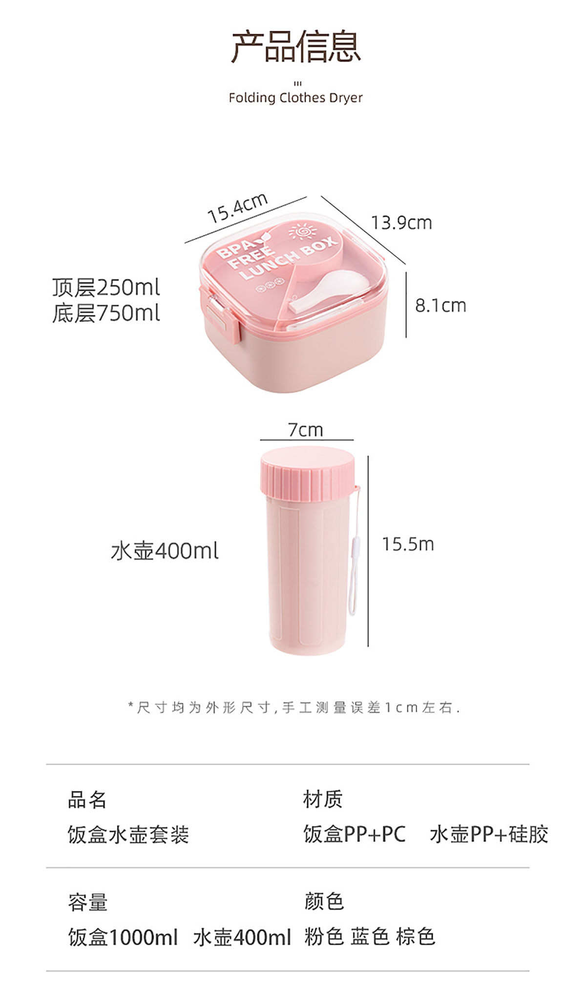 Size: 154*139*81mm/1000ml 水壺:φ70*155mm/400ml