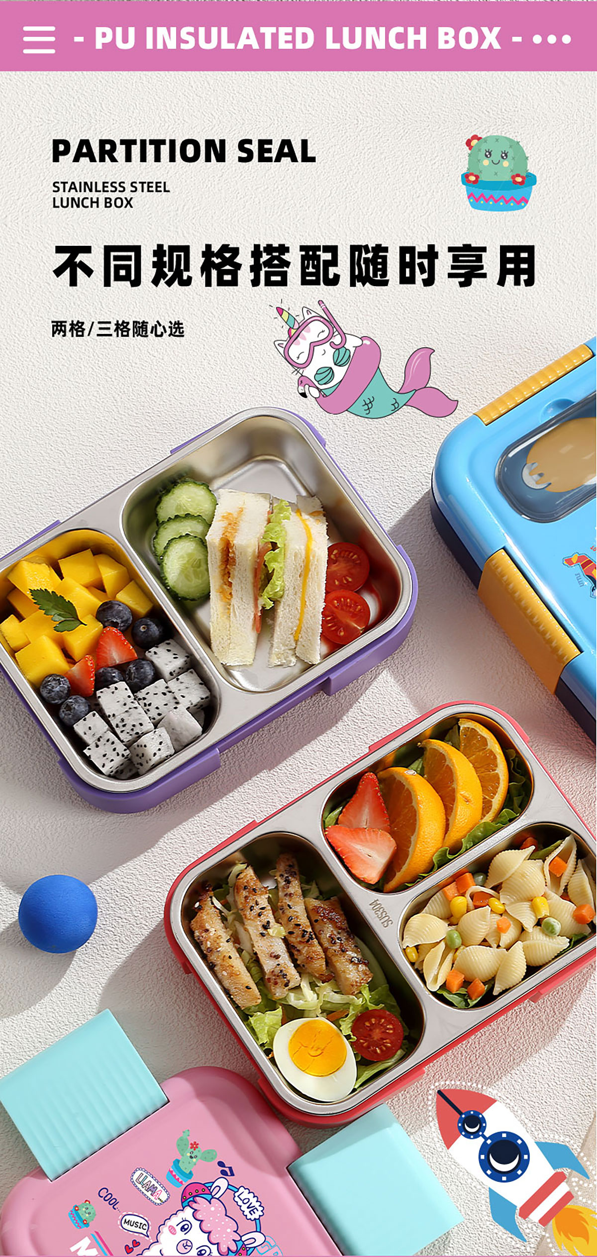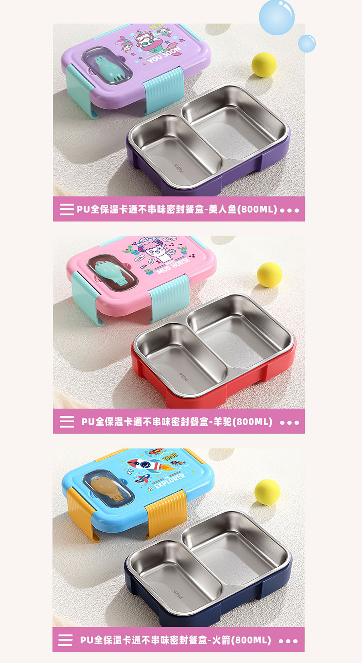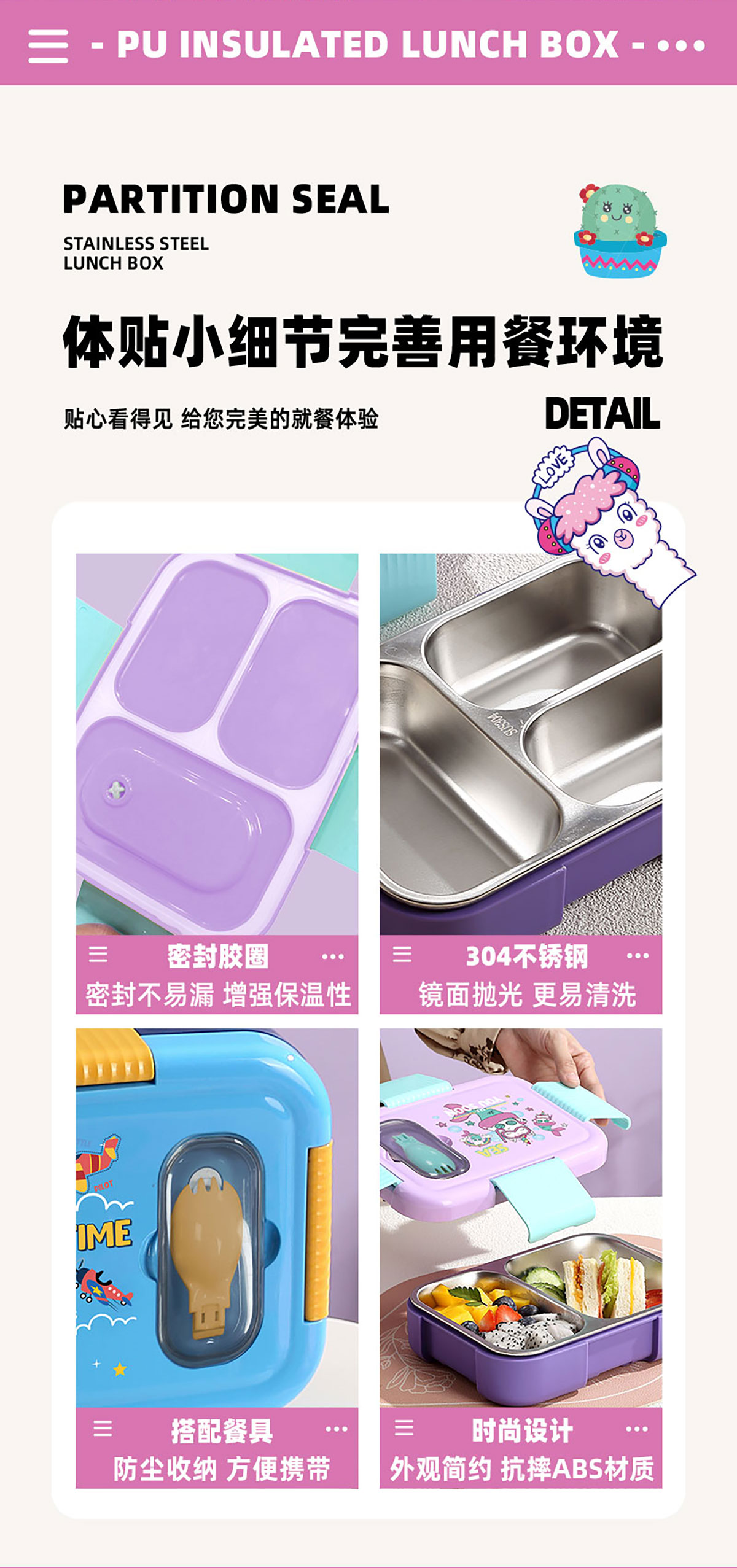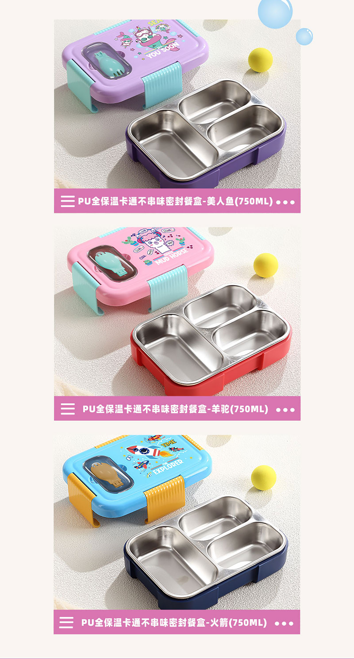 PU全保溫卡通不串味密封餐盒(卡通不銹鋼3格/2格+PP折疊勺)