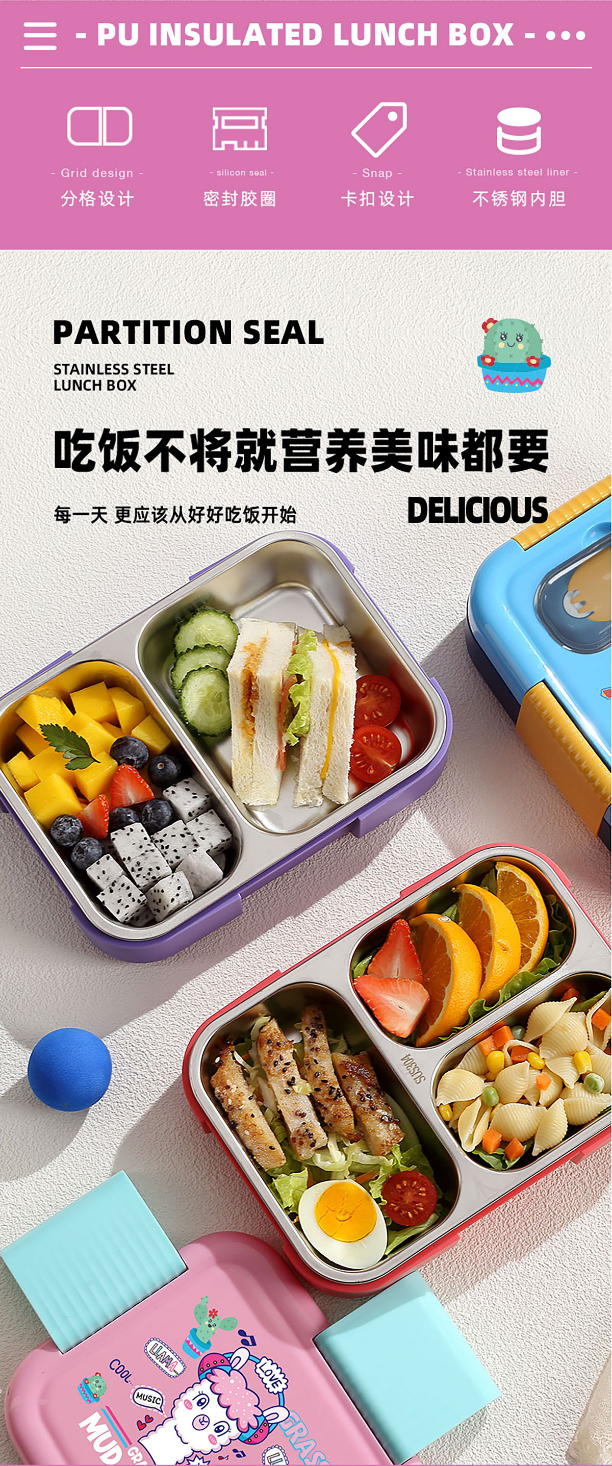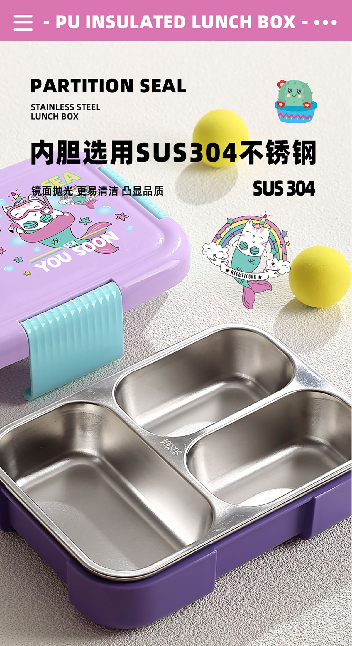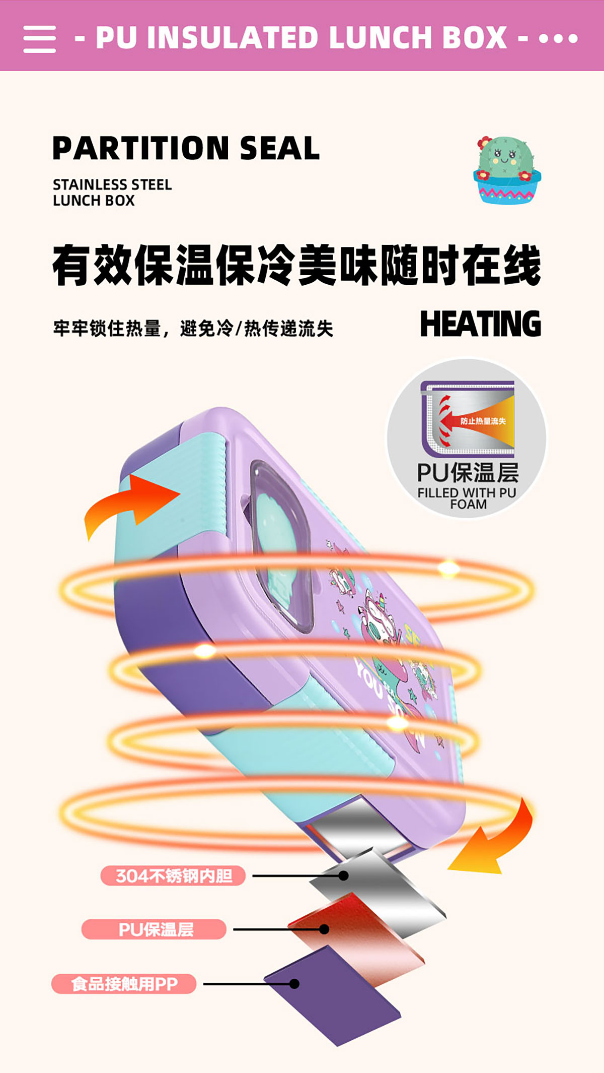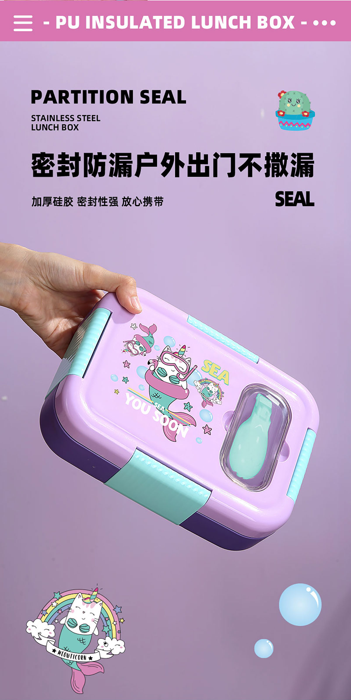 PU全保溫卡通不串味密封餐盒(卡通不銹鋼3格/2格+PP折疊勺)