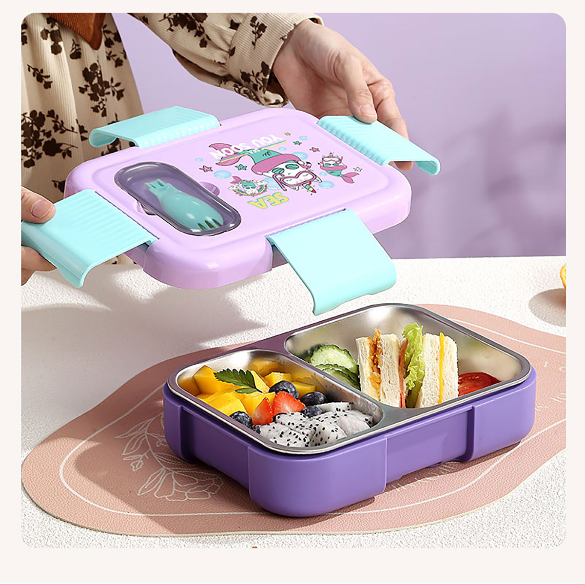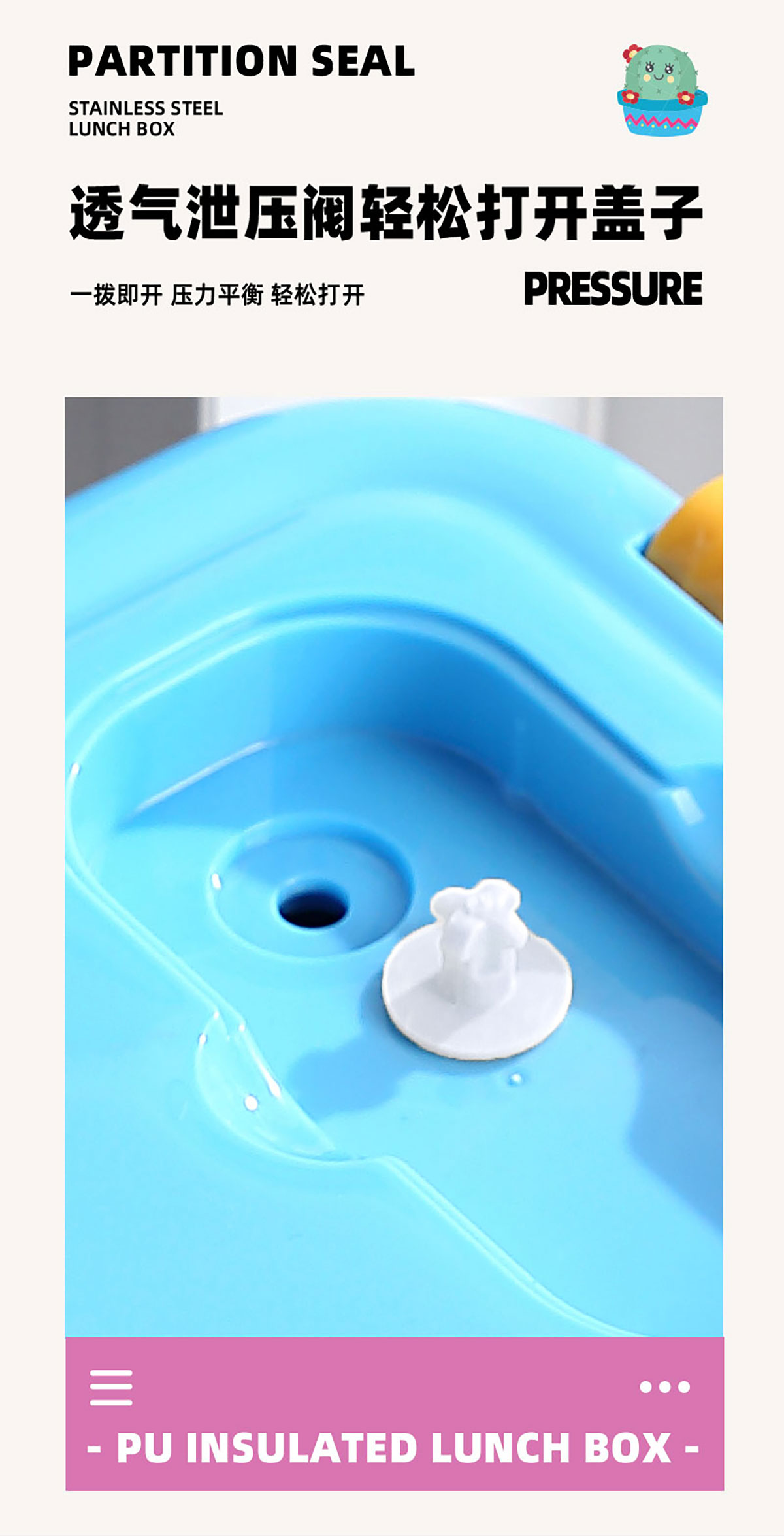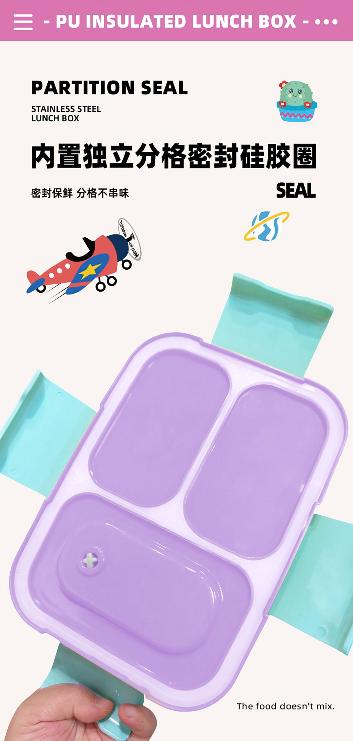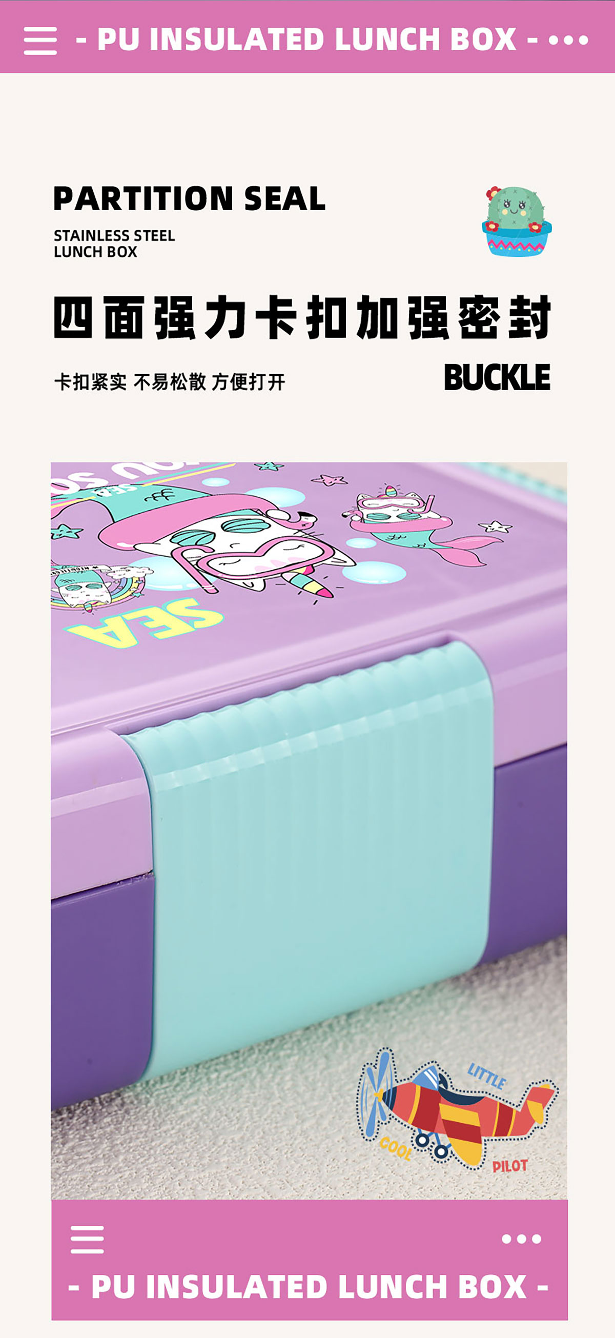 PU全保溫卡通不串味密封餐盒(卡通不銹鋼3格/2格+PP折疊勺)
