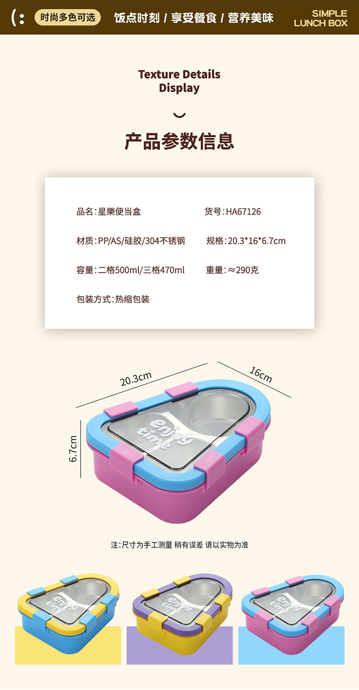 Size: 203*160*167mm(二格500ml/三格470ml)